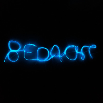 A string of light transformed into the shape of the word BEDACHT, which can be translated into CIRCUMSPECT.